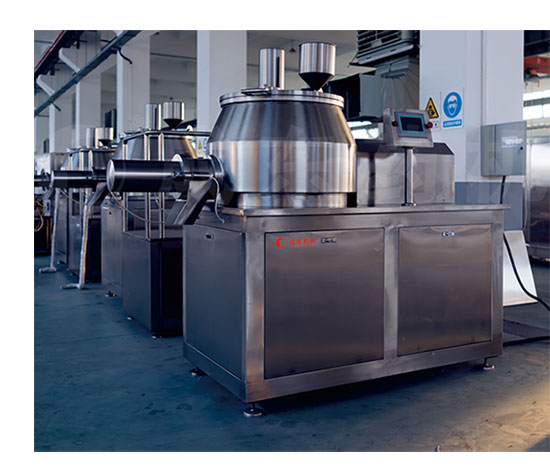 The granulation process of this machine is mixing and granulating by the two processes completed in the same container, powder material in a fixed conical container, due to the stirring action of blend pastes, make the powder lot shake and disperse to present semi-shifting state, and achieve full mix, with the the injection of adhesive, let powder lot become wetting gradually. Material shape change, enhanced the extrusion the blend pastes and cylinder wall act to materials, friction and kneading effect, to form the loose soft material, these soft materials become small, uniform wet granules in the role of granulate pastes, meet(GMP)standards.