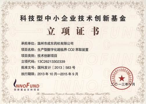 Supercritical fluid extraction(the SFE)is an application of a strong green separation technology, supercritical CO₂ extraction adopts CO₂ as the solvent, supercritical CO₂ fluid under greater density and dielectric constant, the solubility of the material is large, and With the pressure and temperature changes rapidly changing, therefore, not only the solubility of certain substances selective, and easy separation of solvent and extract. We undertake multiple products’ industry standard (China Pharmaceutical Equipment Industry) drafting tasks, Drafted Supercritical CO₂ Extraction Device industry standards was promulgated in August, 2011.